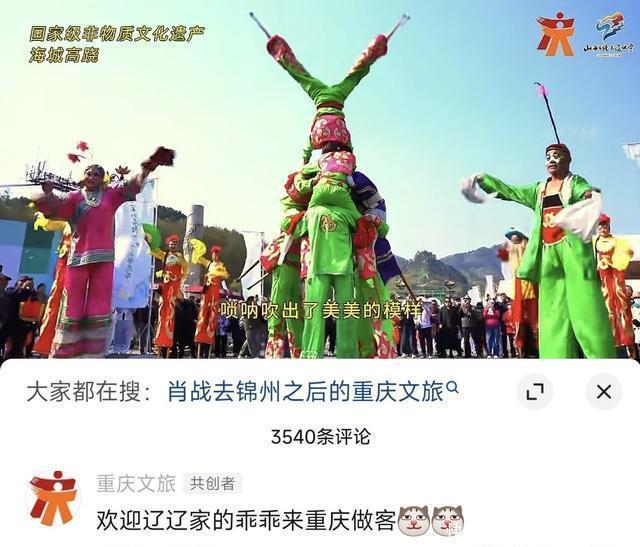 看得出来,肖战来了锦州以后,当地文旅的小编精神状态特别美好,他不光自己积极的宣传,还拉上了肖战的家乡重庆文旅一块共创视频,弄得肖战家乡景区也活跃了起来,各种花式宣传喊话,让人看了直呼,太会整活了吧!